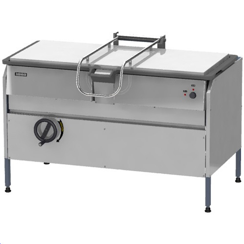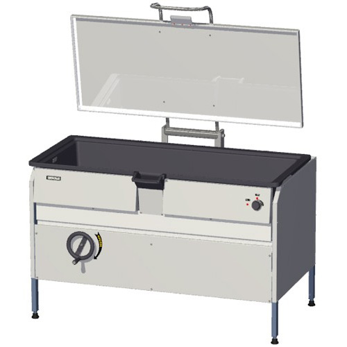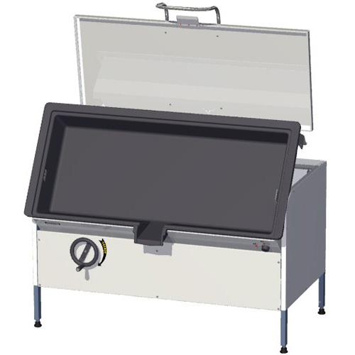Сковорода электрическая опрокидывающаяся оснащена чугунной чашей, регулируемыми ножками, откидной крышкой с пружинным механизмом, автоматическим поддержанием температуры, автоматическим отключением ТЭНов при наклоне на угол более 12°, винтовым механизмом опрокидывания путем вращения маховика.